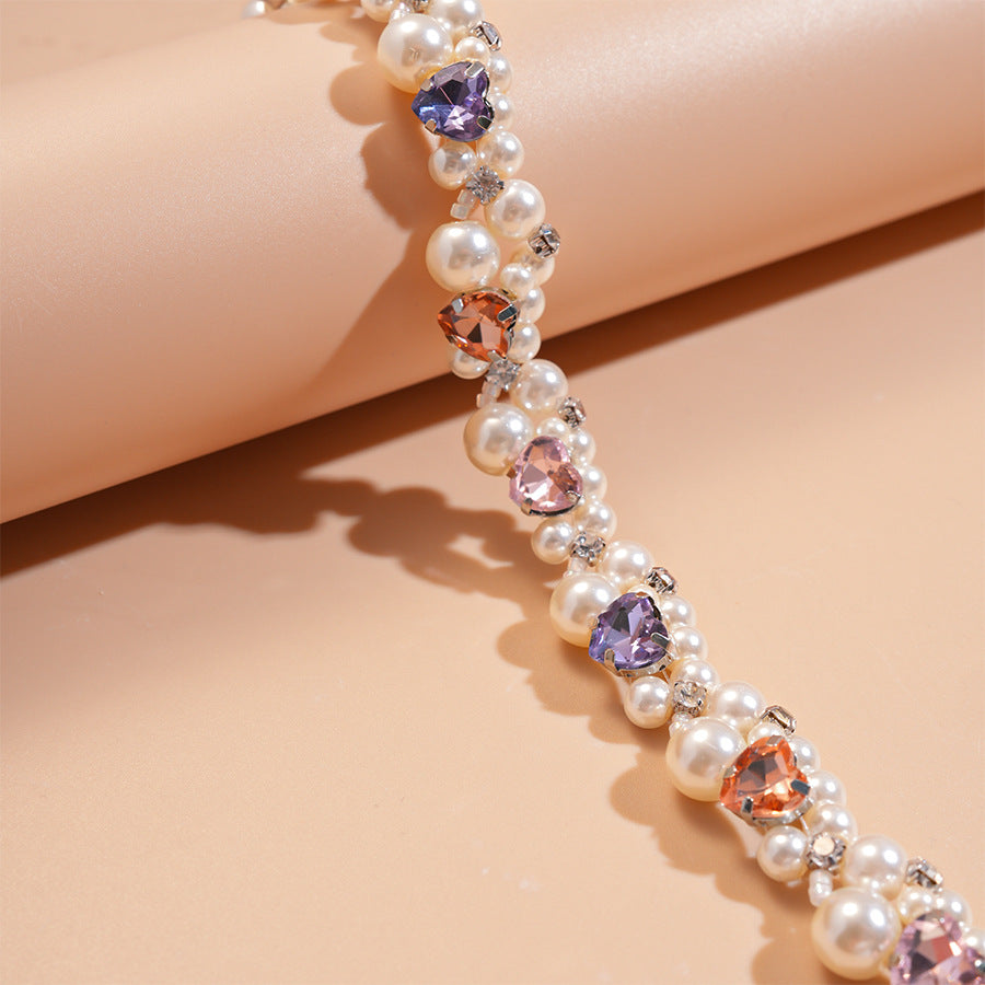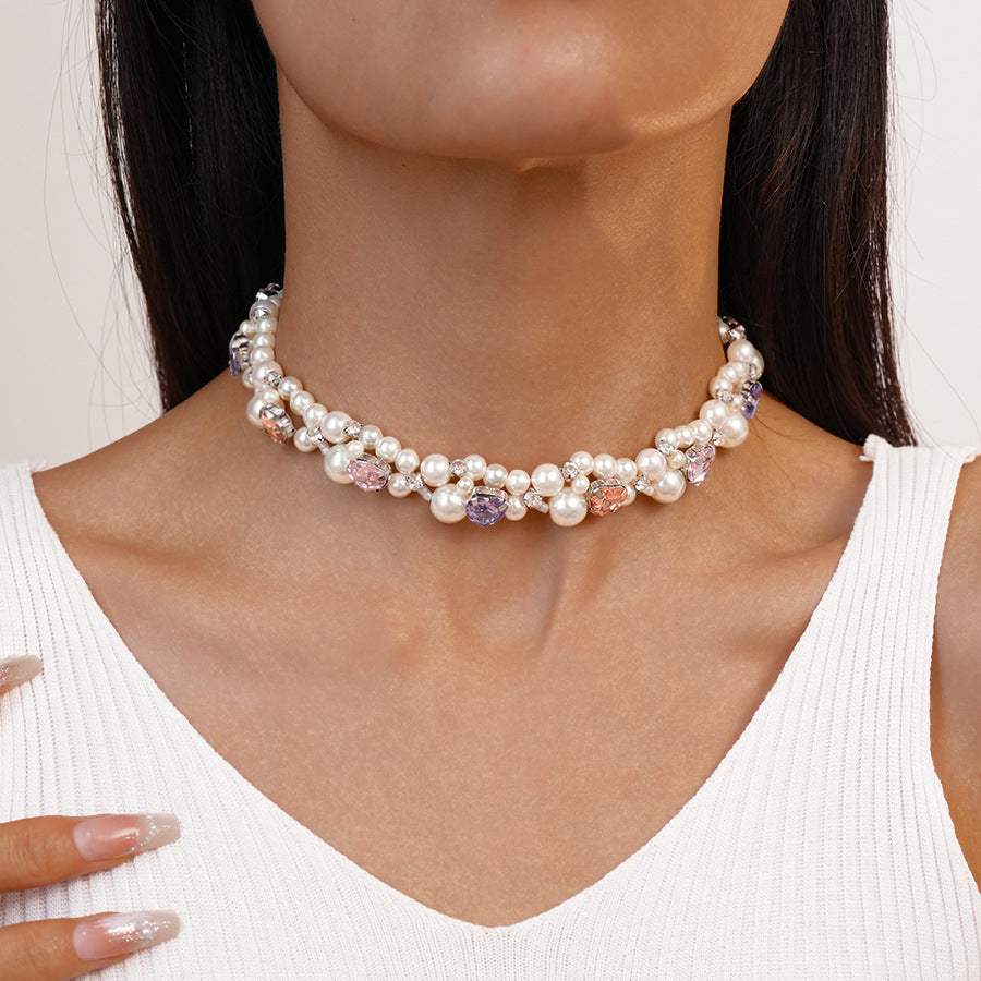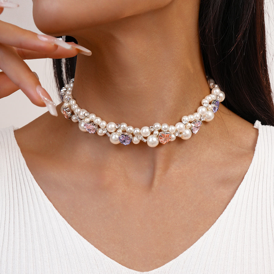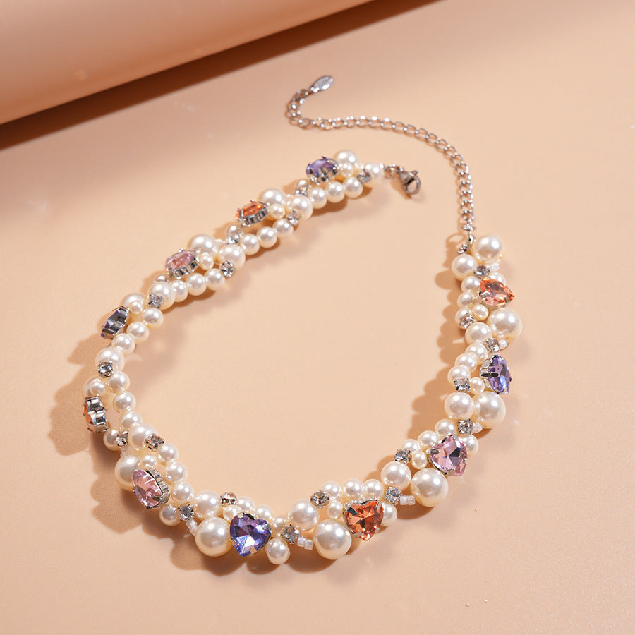 このネックレスはデザインが非常に目を引きます。真珠を中心に、多彩なハート型のジュエリーが組み合わされています。真珠は丸く白く、温かい質感があります。ハート型のジュエリーにはピンク、紫、オレンジといった柔らかい色調があり、マカロンのように清々しく甘美です。それらが互いに絡み合って配置されており、真珠の優雅さを保ちつつ、カラフルなジュエリーの加わりで活発でキュートな雰囲気も加わり、全体的に精緻でロマンチックな雰囲気になっています。シンプルなコーディネートにアクセントを加えるのに非常に適しており、日常の外出や小さなパーティーにも、簡単に視線の中心になることができます。