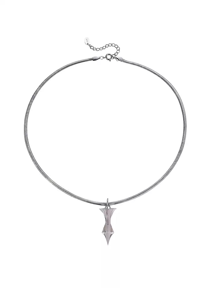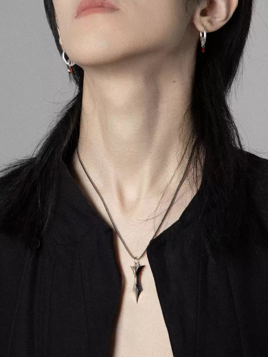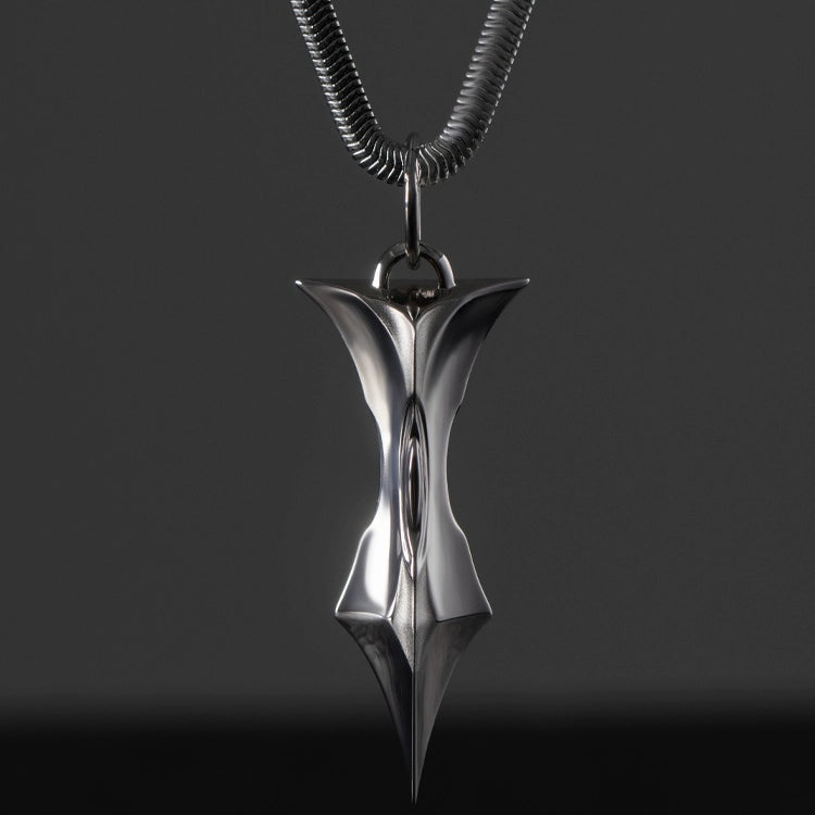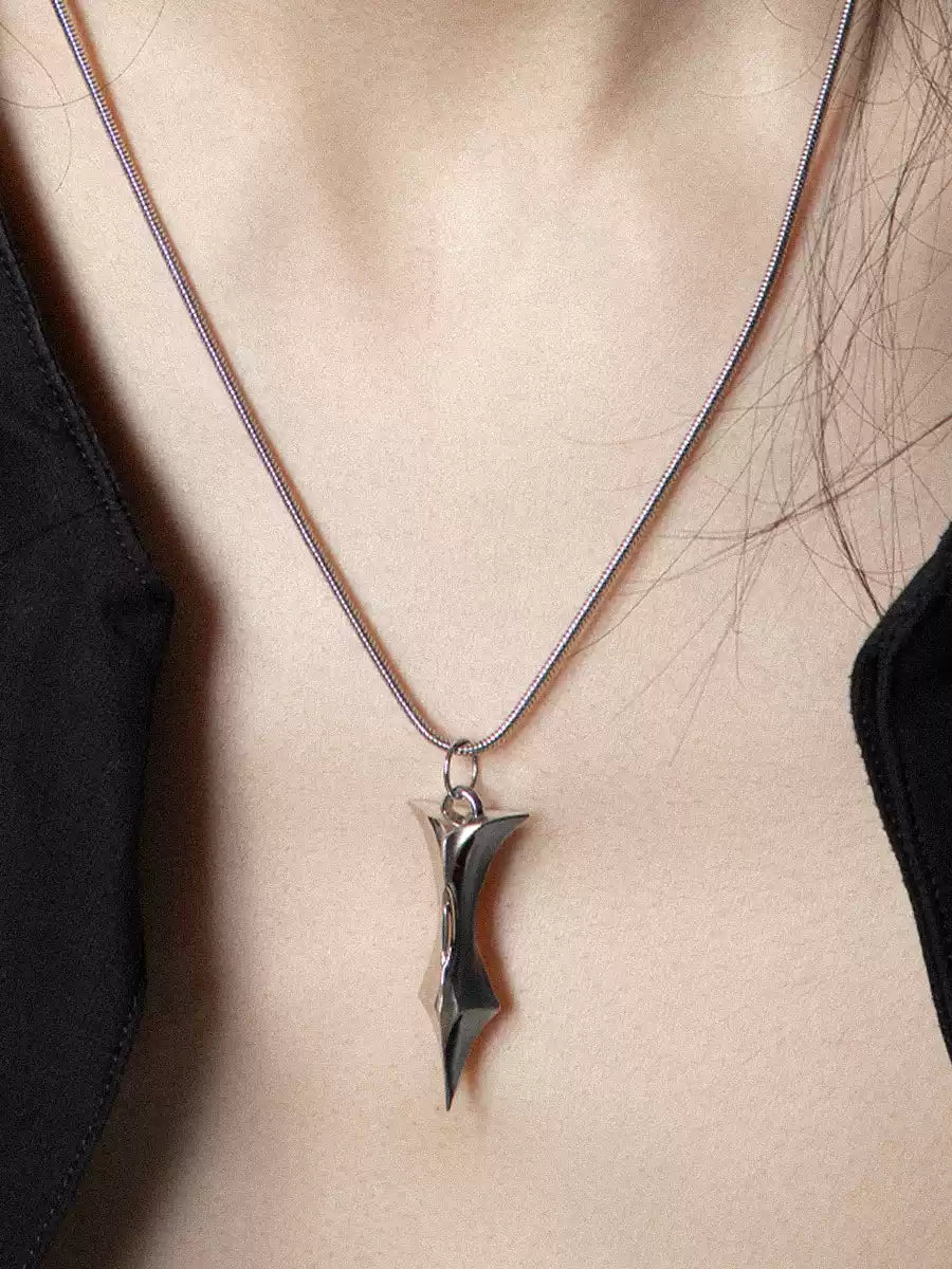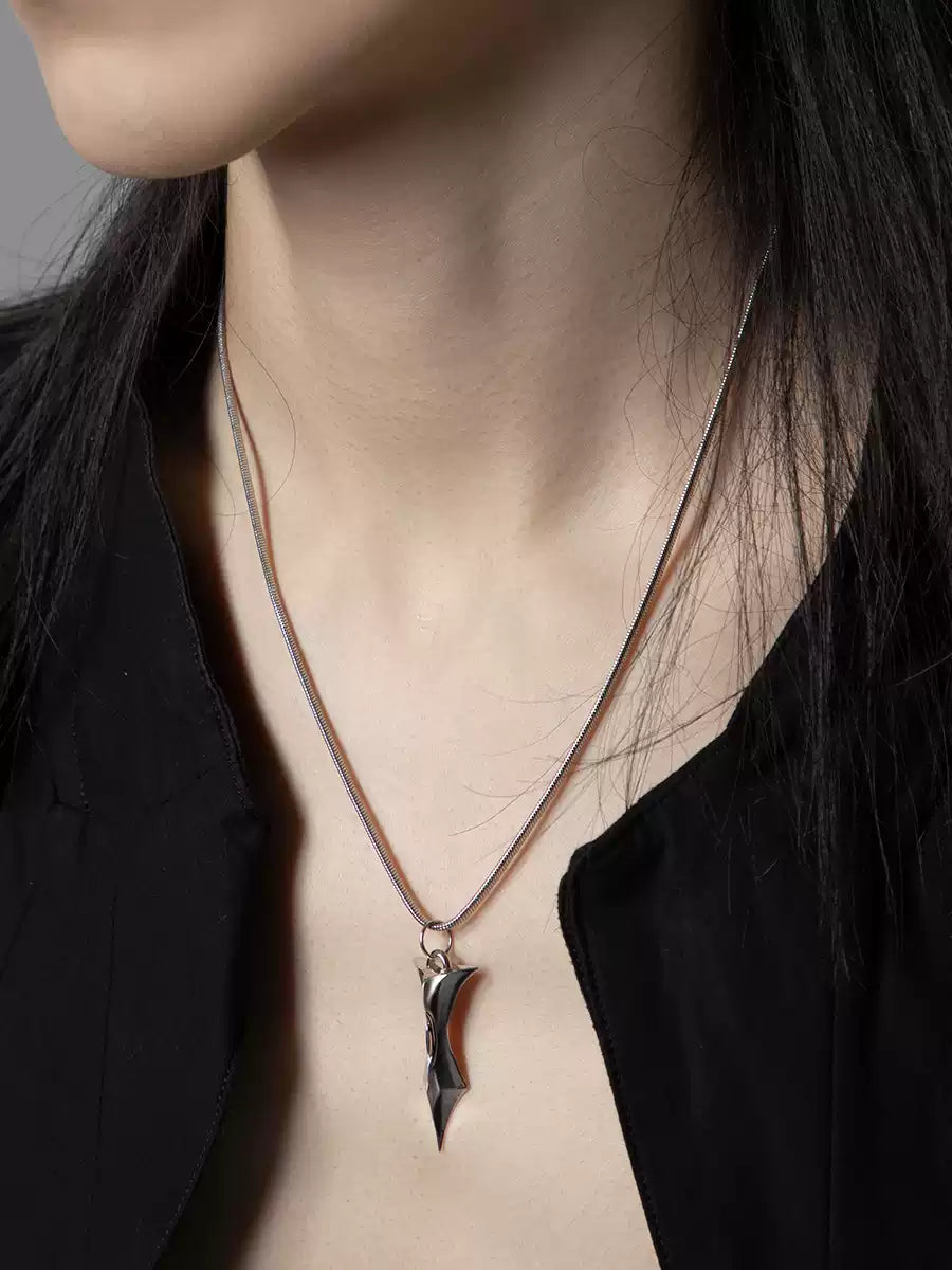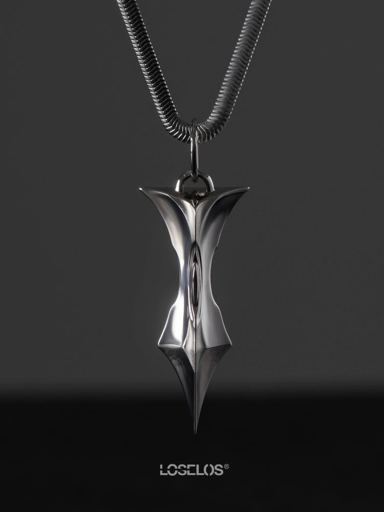 全体的にシンプルながらも、幾何学的で先鋭的な形状が特徴的で、まるで何かの神秘的なパワーを宿しているかのような雰囲気が漂っています。鎖はシンプルなデザインで、ペンダントの存在感を邪魔することなく、むしろその独特さを引き立てる役割を果たしています。