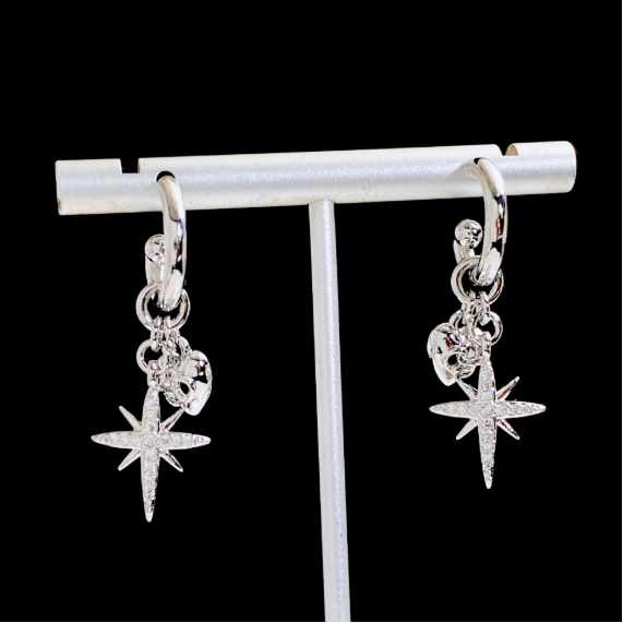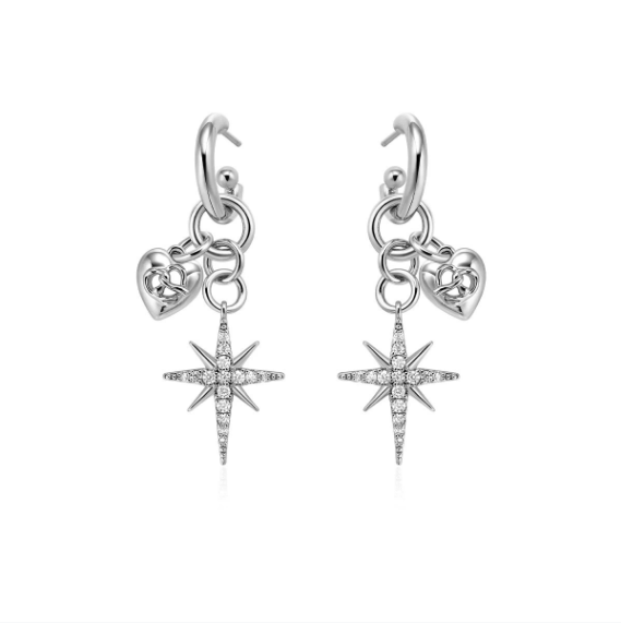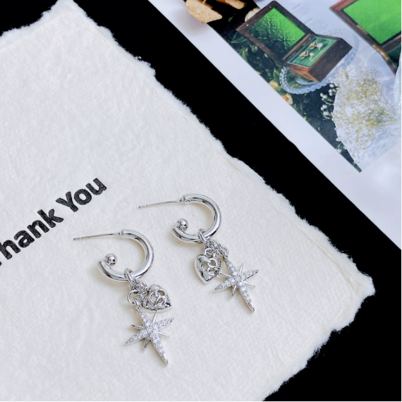 このピアスは、軽奢な雰囲気と個性的なデザインが融合した魅力的なアイテムです。輝きのあるジルコニアで装飾された八芒星と、愛らしいハートが組み合わさり、流れるようなフリンジ(フリンジ)デザインが動きのある美しさを演出します。