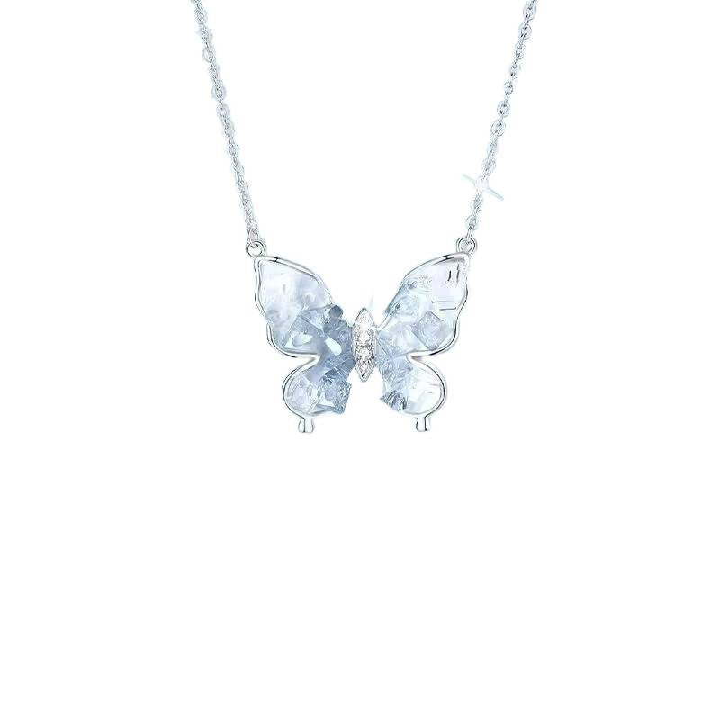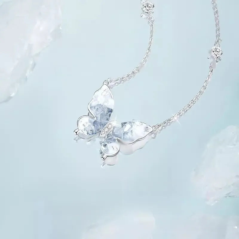 「氷島のバラ」という名前のこのネックレスは、蝶を造形の核としていますが、バラのようなロマンと氷島の清澄感を秘めています。蝶の羽の部分は氷の結晶のような素材を使い、薄い青みの色調を帯びており、まるで氷島に凝結した透き通った結晶のようで、光を当てると活き活きとした輝きを屈折させ、あたかもバラの花びらに宿った朝露がきらめいているかのようです。銀製のチェーンと蝶の輪郭は、全体に精緻さを加えており、首につけると、蝶がそっと舞うような機敏さがあると同時に、氷島の清々しく上品な雰囲気とバラの優しいロマンも兼ね備えています。まるで氷島の純粋さとバラの愛情を、この小さな蝶の造形に凝縮したかのようで、独特な美しさと素敵な意味合いを伝えられる精緻なアクセサリーです。