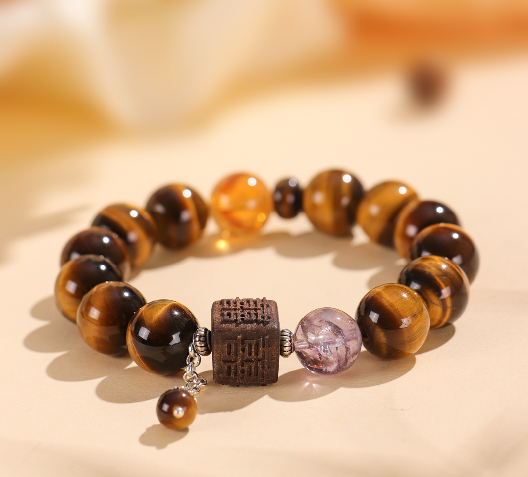 別のブレスレットでは、トラの目石はいずれも丸みを帯びてふっくらとしており、その間には文字や模様が刻まれた黄水晶のビーズが差し挟まれています。細部に至るまで気を配った作りで、レトロな雰囲気の中に精緻さが漂い、腕につけると落ち着きながらも活気のある雰囲気を伝えるようです。